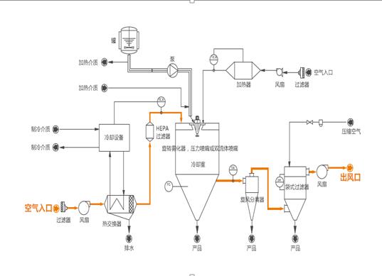 噴霧冷凍干燥機(jī)系統(tǒng)由噴霧塔、噴嘴、加熱裝置、儲(chǔ)液槽、過(guò)濾系統(tǒng)、閥門(mén)、空氣過(guò)濾、鼓風(fēng)機(jī)、冷凍壓縮機(jī)、加熱系統(tǒng)、旁路管、為噴嘴所提供的噴霧氣體等組成