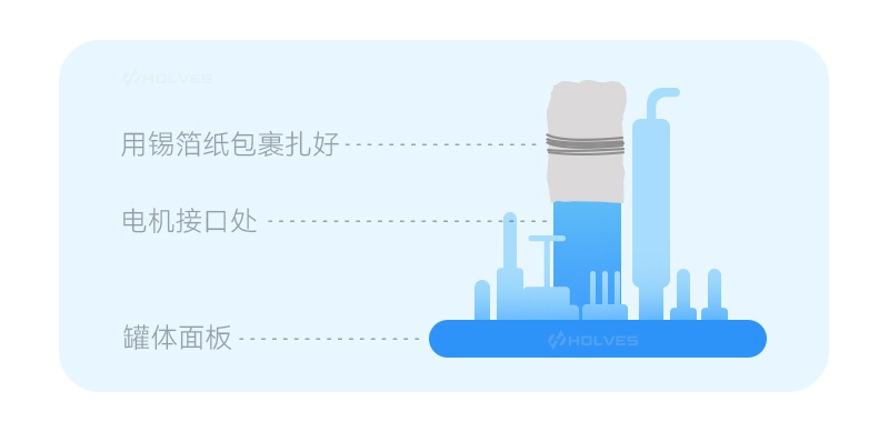 取下生物反應器的攪拌電機,平放于桌上,電機接口處用錫箔紙包好并用皮筋捆扎,防止滅菌過程脫落,以消除高壓蒸汽滅菌時產(chǎn)生的高溫蒸汽對電機接口的破壞。