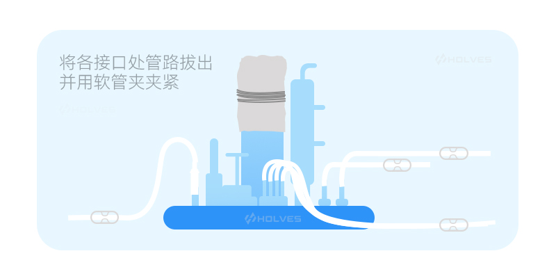 收獲管、備用管口分別使用軟管夾夾緊面板端。