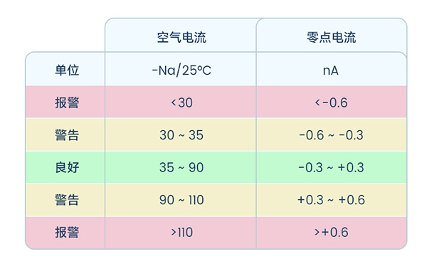 以空氣為校準介質(zhì)進行校準后,參考極譜式溶氧電極電流信號表中空氣電流的標準,判斷DO電極的斜率是否正常。