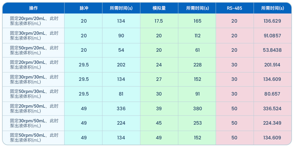 從表中數(shù)據(jù)可以看出,一旦改變了轉(zhuǎn)速和泵出量,不同的驅(qū)動(dòng)方式控制的蠕動(dòng)泵會(huì)有不同結(jié)果。3種驅(qū)動(dòng)方式中,RS-485通訊方式的控制精度最優(yōu),脈沖次之,模擬量的誤差最大。